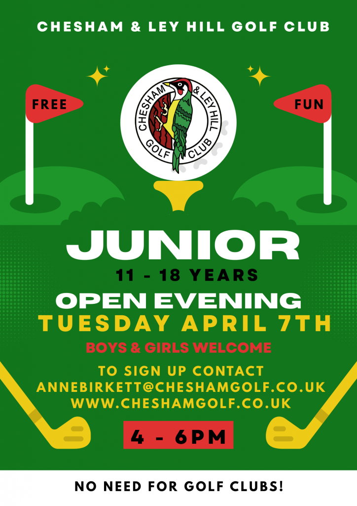 Chesham and Ley Hill Golf Club aer running a Junior Open Evening for boys and girls between the ages of 11 – 18 years on Tuesday 7th April from 4 – 6pm.